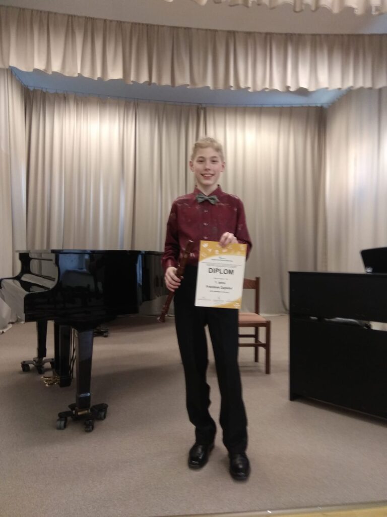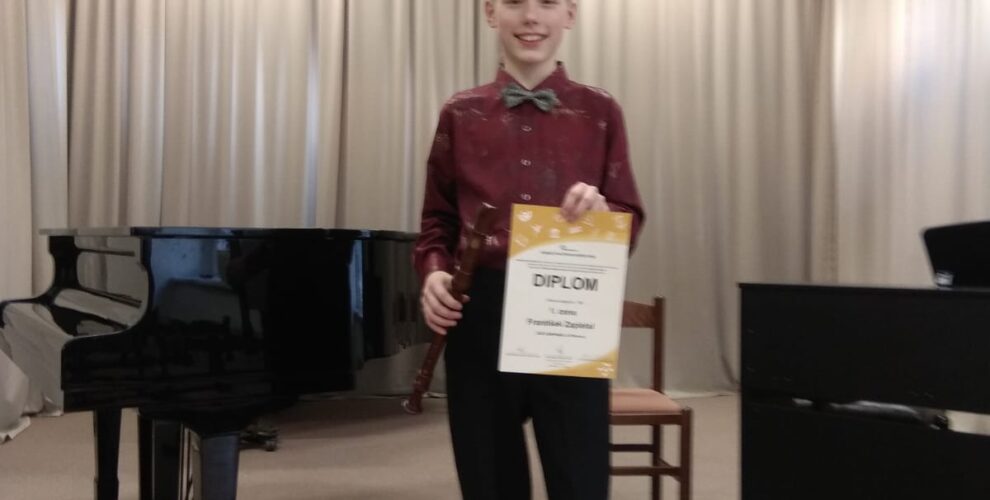 František Zapletal získal 1. místo a postup do ústředního kola v krajské soutěži MŠMT ČR ve hře na zobcovou flétnu. Gratulujeme!