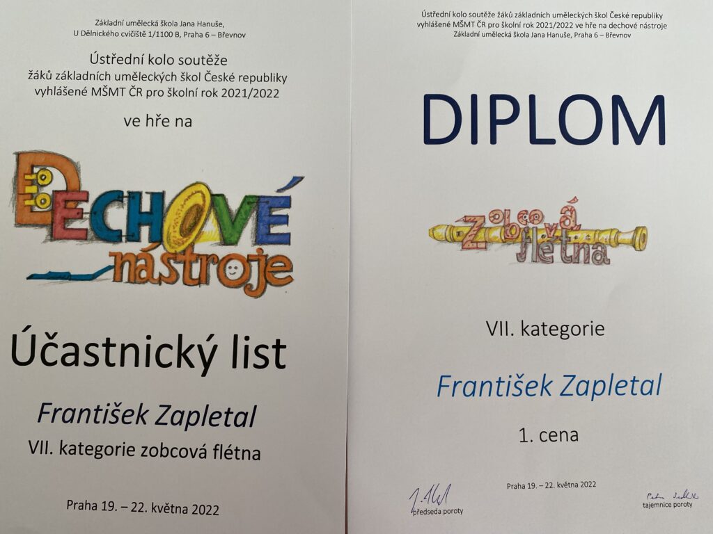 František Zapletal získal 1. místo v celostátním kole ZUŠ ve hře na zobcovou flétnu, gratulujeme!