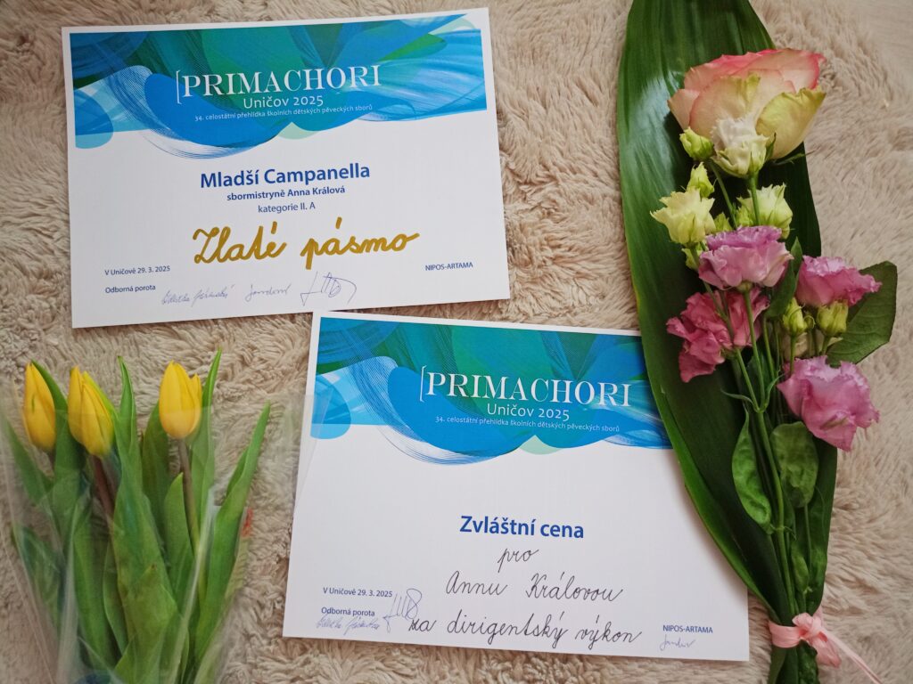 I v tomto školním roce se Mladší Campanella zúčastnila soutěžní přehlídky pěveckých sborů Olomouckého kraje v Uničově a získala zlaté pásmo ve své kategorii. Svým výkonem zaujala porotu sbormistryně Mgr. Anna Králová a obdržela zvláštní cenu za dirigentský výkon. Gratulujeme všem a děkujeme za reprezentaci školy.