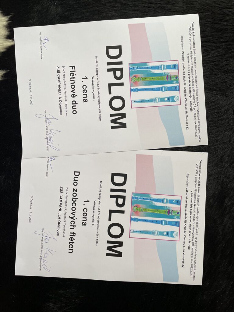 Dne 15. 2. 2023 proběhlo v ZUŠ Iši Krejčího v Olomouci okresní kolo soutěže Komorní hra s převahou dechových nástrojů. Soutěže se zúčastnili – duo Klára Nierychelová a František Techmann (vyučující B. Matějová), duo Dana Kylarová a František Zapletal a trio Dana Kylarová, Anežka Procházková a František Zapletal (vyučující M. Dvořáková). Jmenovaní soutěžili ve 4 kategoriích, ve kterých zvítězili. Flétnové duo Dana s Františkem obdrželo od poroty zvláštní ocenění za interpretaci skladby P. Anthony: The Mosquito´s courtship.